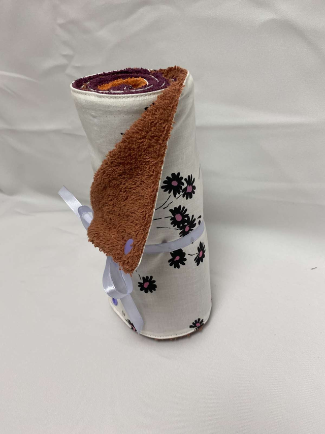 1 coté éponge, 1 coté tissu imprimé.
