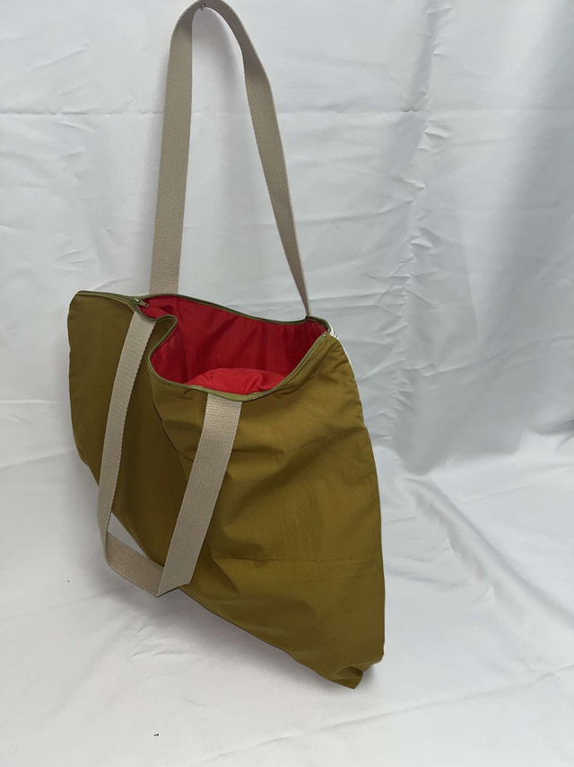 Sac doublé, une poche intérieure, fermeture par zip, deux anses.
